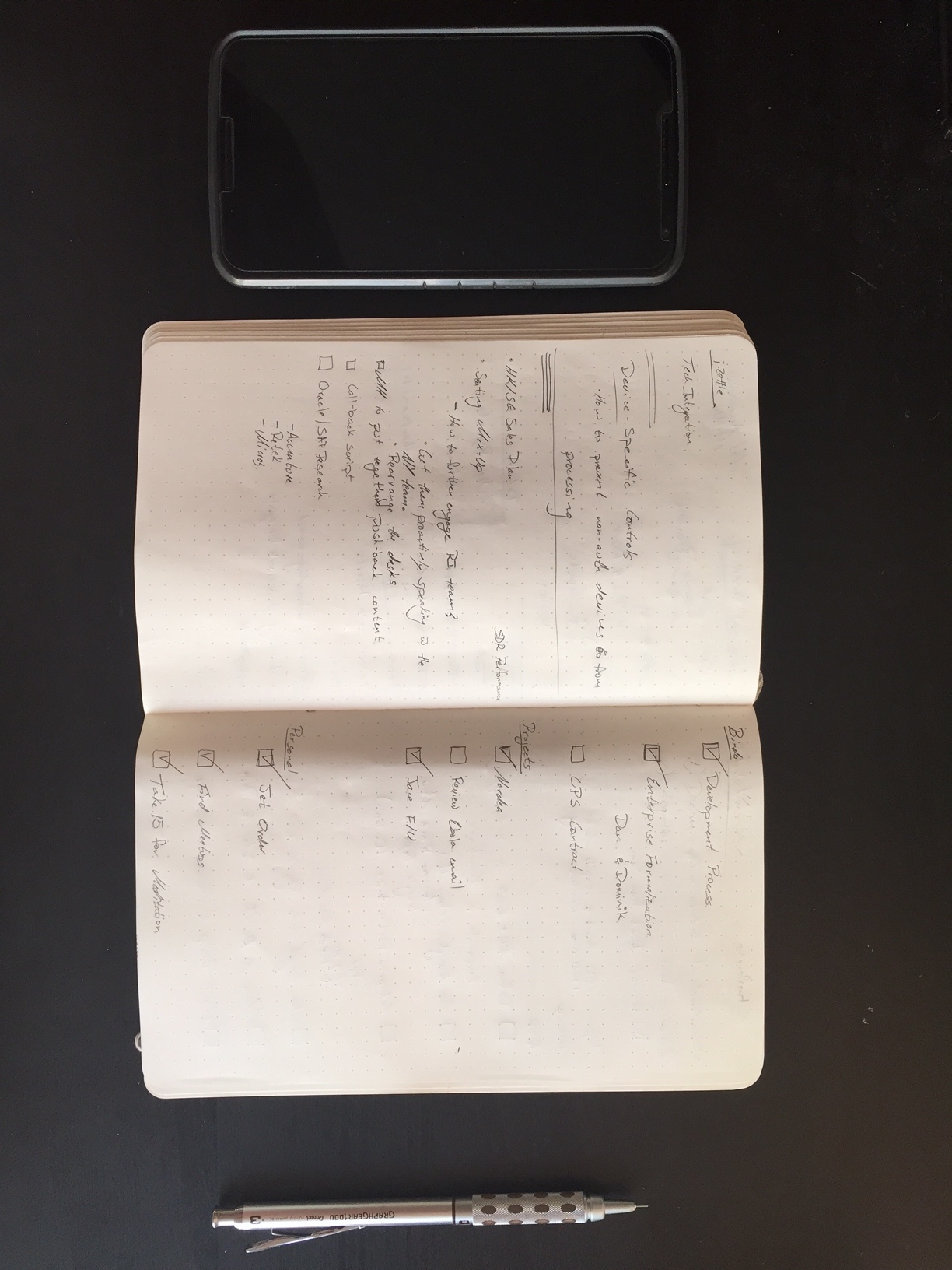 I like to keep a notebook where I have three sections on there right and an open page for notes on the left. The right page I jot down thee important tasks for each section. The left page is for lesser priority; things I should be doing that are of less importance or are tasks too big to complete all at once. (Below, I added a section which will show you another methodology that I found immensely helpful.)
